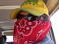 And once again, here are some remnant photos to round out the July trip selection. These include the menu at Monty’s Cafe in Darwin, Mike donning his dust protection gear, another drive past a bush burn off, and Steve holding a long neck turtle which we encountered on one of our journeys near a swamp.