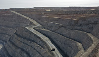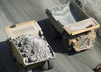 Several shovel fulls are required to fill one of the trucks seen here. These trucks run non-stop 24 hours a day hauling out ore.