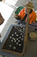 Next on tap we paid a visit to the ‘Two Up’ ring just outside town. As mentioned in my last posting, anywhere there are many men and few women, the predicted vices seem to crop up – and gambling is of course one of them. Two Up is a simple game based on a coin toss – you can read about it here if you wish to know the rules and history. We had been given a demonstration and some play money to get us going, and we had a lively game at the now dilapidated ring. Michael and I were NOT on the winning end I must add.