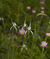 While many of the orchids look similar, on closer inspection you see that they are in fact different. The spider orchids come in several flavours. There are bearded and smooth varieties as well as colour variations. At the very left is a bearded and beside it is a smooth. The grouping of 5 above are dark tipped spider orchids. At right below is an antelope orchid.