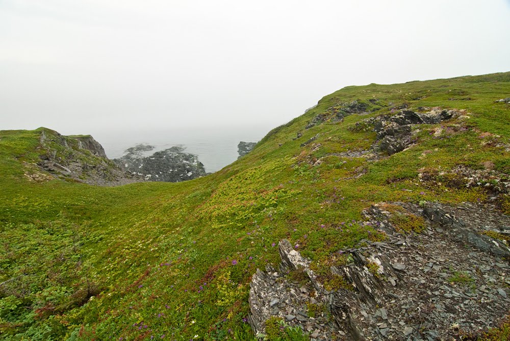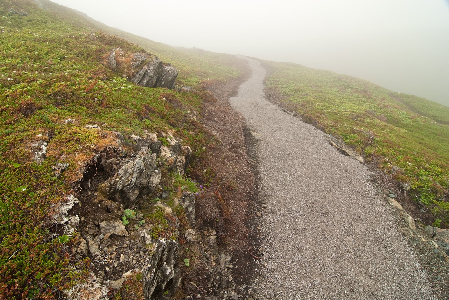 After checking into our B&B at Viking Nest, we took the local trail up the hill outside Hay Cove. Since it was lightly raining, Mike decided to leave his camera behind – which was a mistake as the views from the top of the fog rolling into the bays was spectacular.
