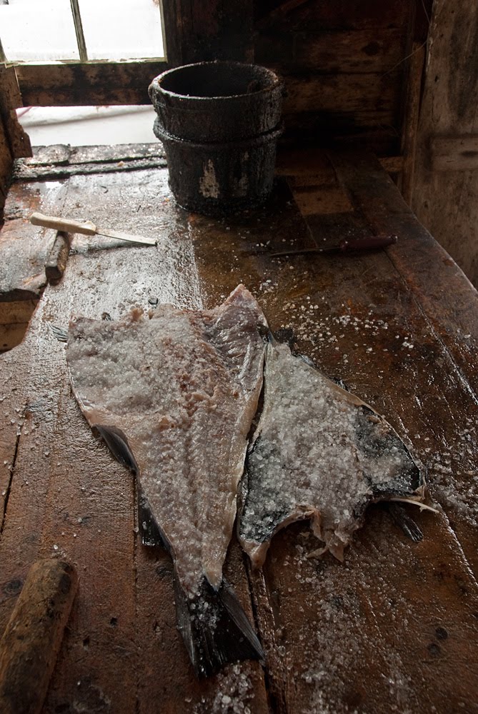 These fish were then laid out off to the side in an alternating pattern and layered with salt – an extremely important step. If any of the skin was exposed, fly eggs would survive into maggots and ruin an entire section of fish (fish here means only one thing – cod). The hut would be filled until the weather was right for drying. If it was to get wet, the fish goes yellow and quality goes down (hence the price too). If it is out in the hot sun, it gets white and powdery – called burnt – and the price goes down. Both result in the salt being drawn out of the cod and ruining the storage life.
