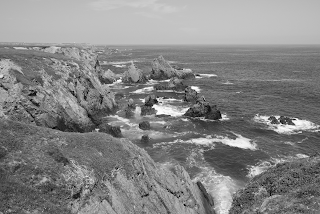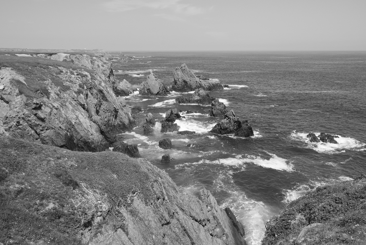 The sky was very interesting as there were small patches of clear sky in the north distance and thin strips to the west – but there were also vast bands where you could see the rain and fog. And all above a landscape of cliffs, breaking waves, islands and lush green mosses.